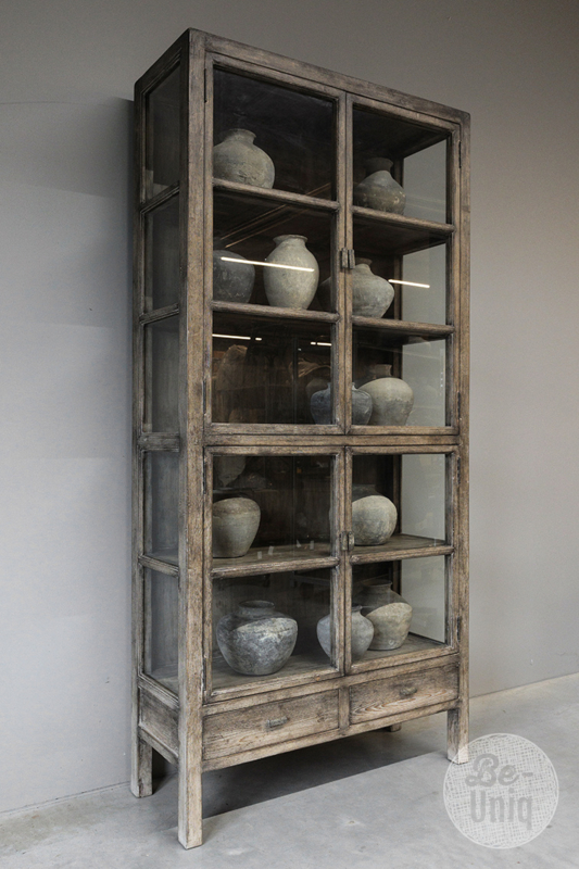 Grote oud vergrijsd houten kast 235 x 112 x 43 cm glaskast vitrinekast keukenkast glas glazen deurtjes landelijke kast