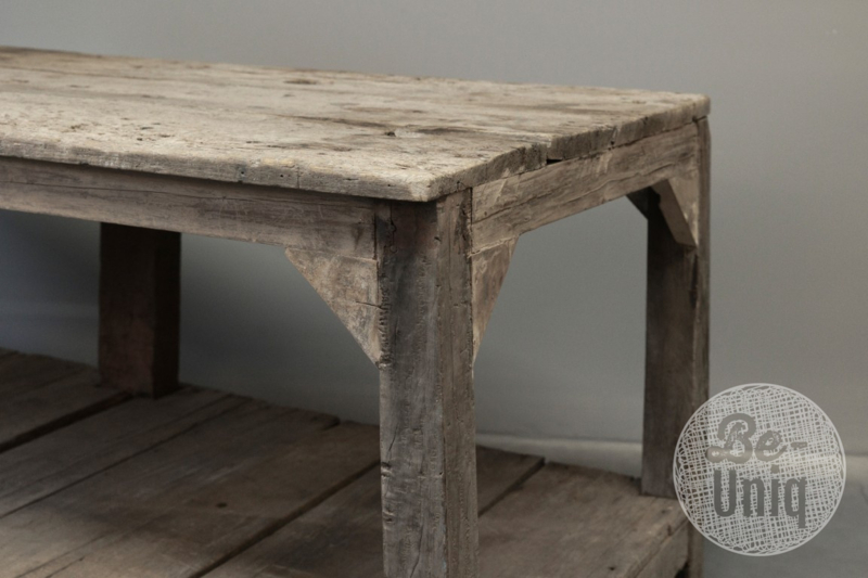 Grote oude vergrijsd houten originele tafel 180 x 83 x H79 cm workmate kookeiland boerderij ladekast werkbank met onderplank Sidetable wandtafel toonbank winkeltafel presenteertafel werkbank keukenblok landelijk stoer industrieel vintage keukeneiland