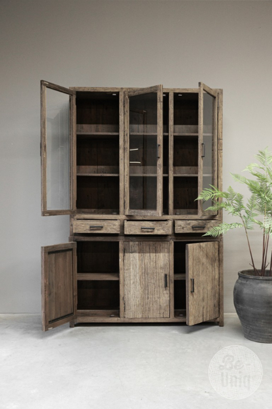 Grote truckwood railway houten kast vitrinekast wandkast keukenkast servieskast 225 x 175 x 45 cm landelijk stoer industrieel SEP oud hout