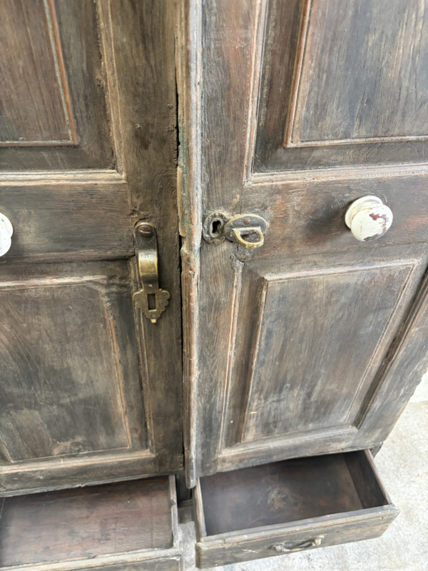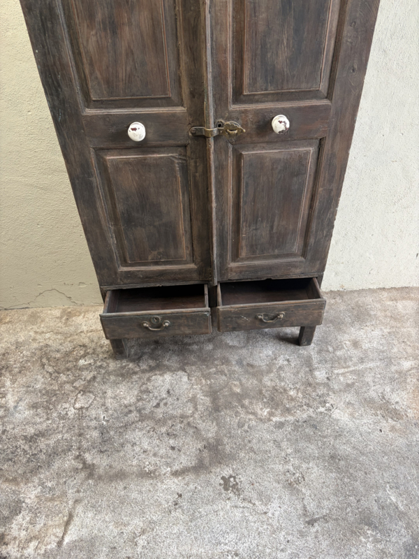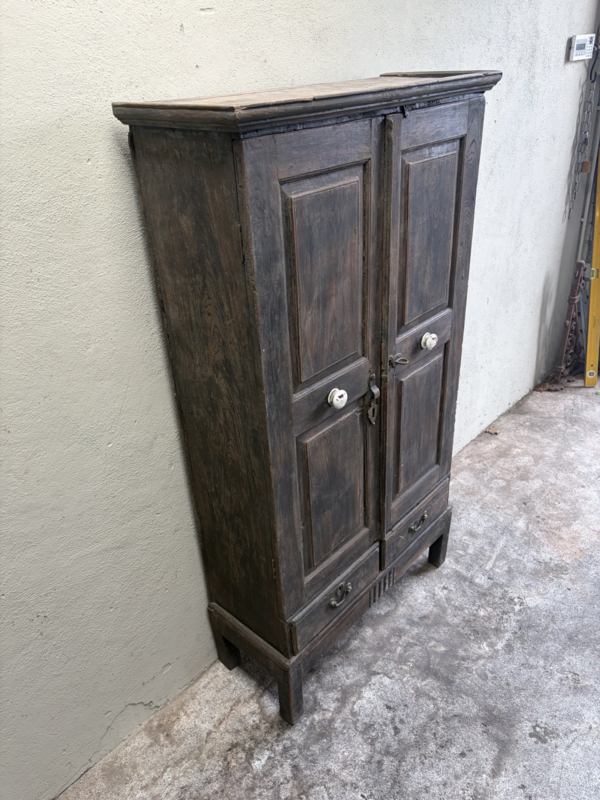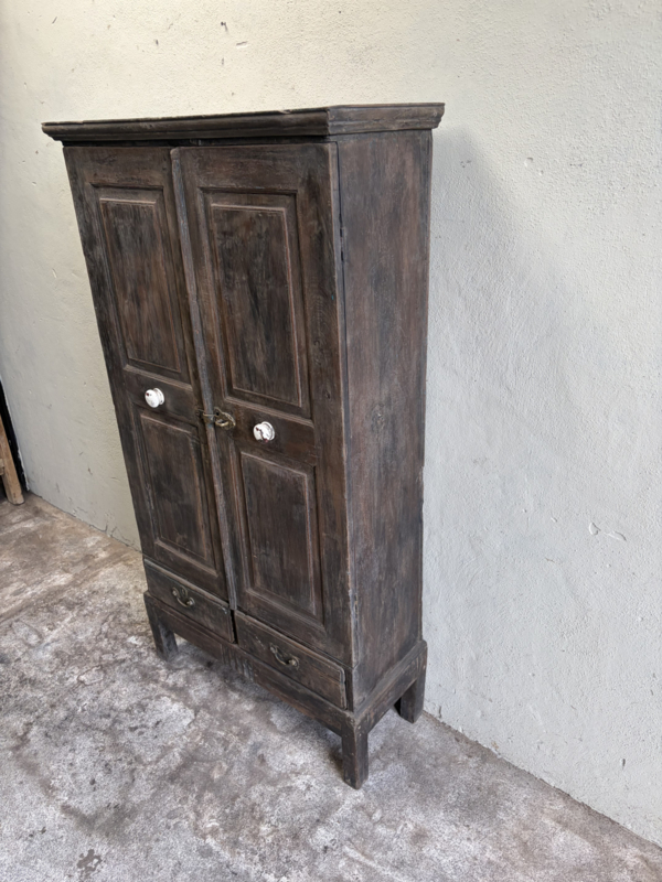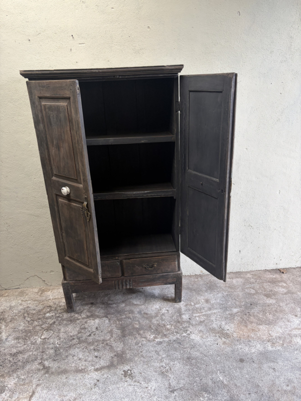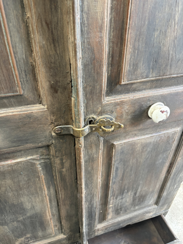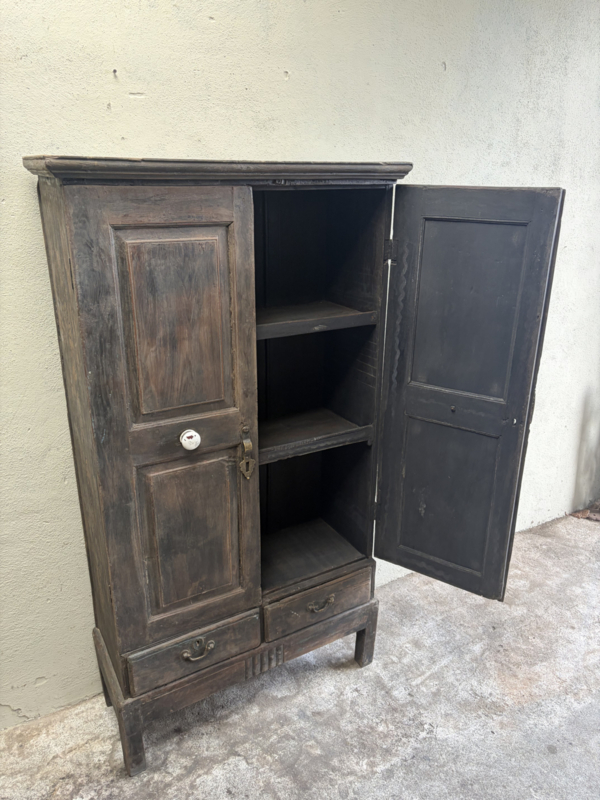 Oud houten kast kastje 2deurs en 2 lades halkastje dichte kast legplanken vergrijsd origineel oudje landelijk stoer sober