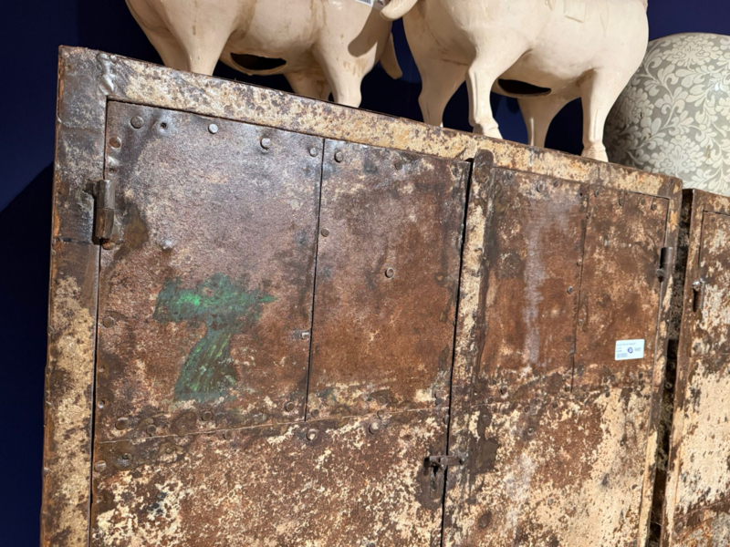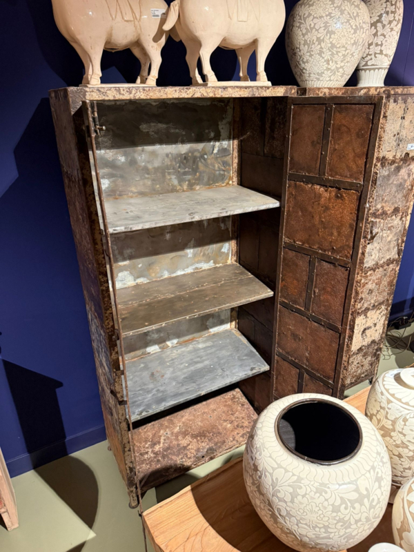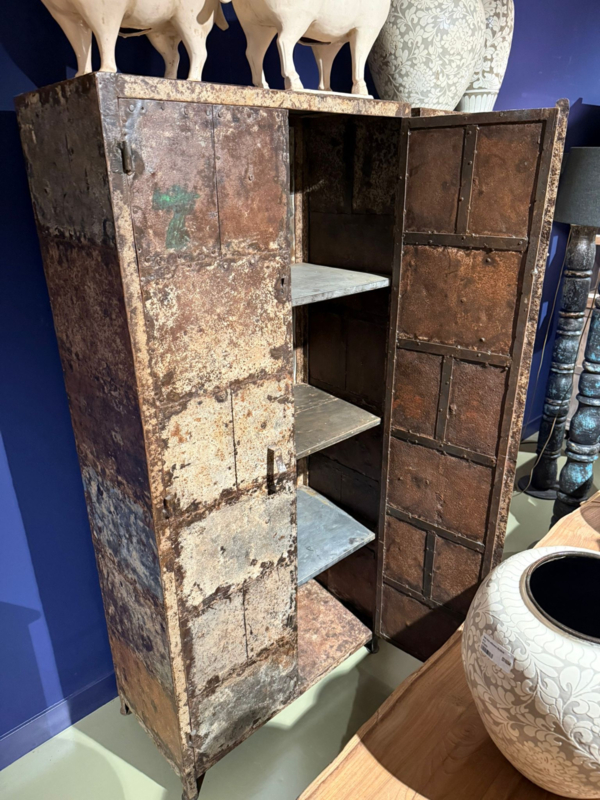 Gave grote metalen kast met 2 grote deuren waarachter legplanken