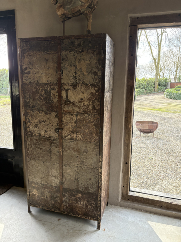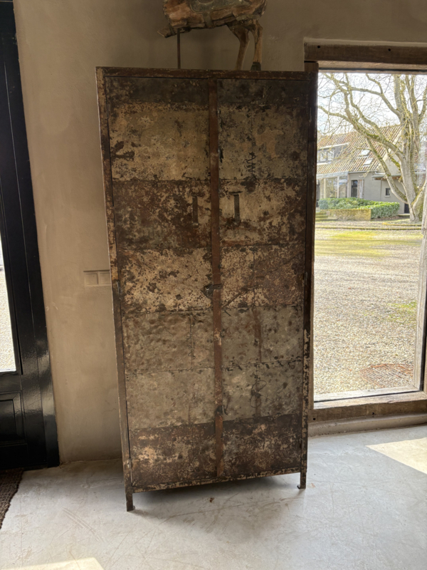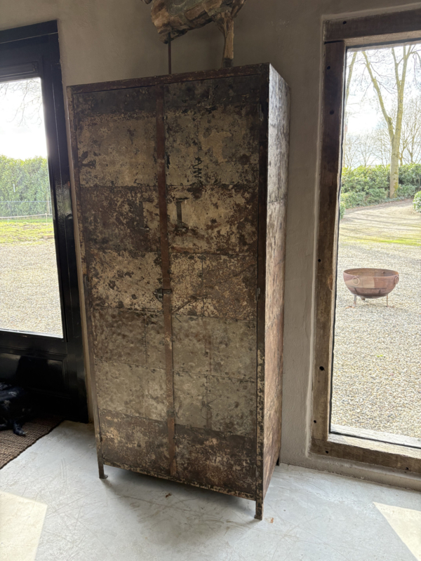 Grote oude metalen locker lockerkast ordners boekenkast archiefkast urban kantoor stoer metaal grijsbruin industrieel landelijk urban 2 deuren legplanken