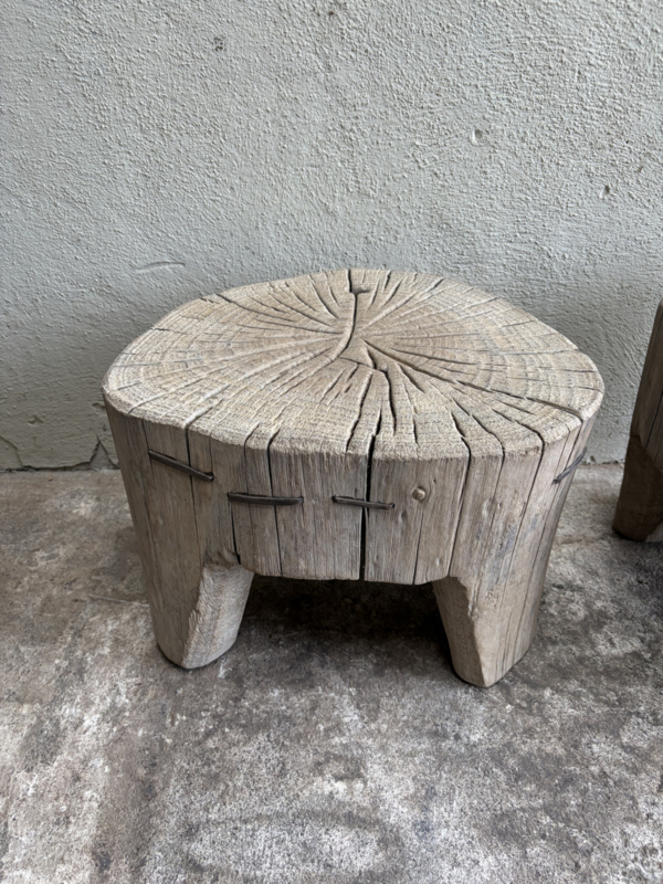 Kleine grof vergrijsd houten kruk krukje bijzettafeltje tafeltje stronk boomstam