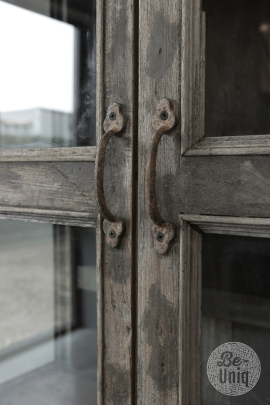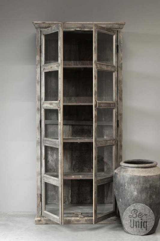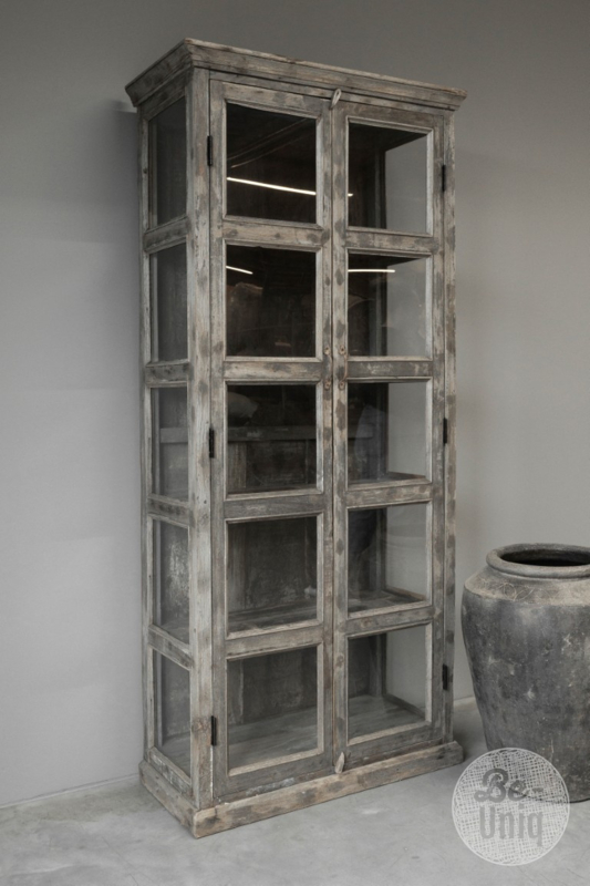 Grote unieke hoge oude vergrijsd houten vitrinekast kast glaskast winkelkast vitrine landelijk stoer vintage 214 x 92 x 42 cm