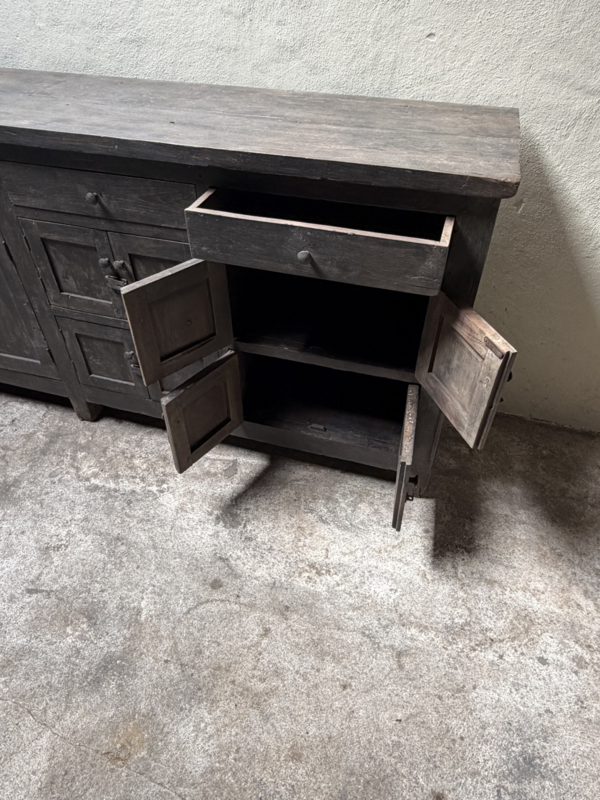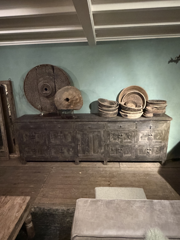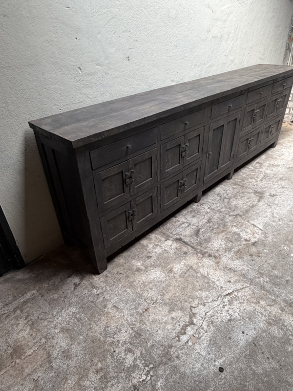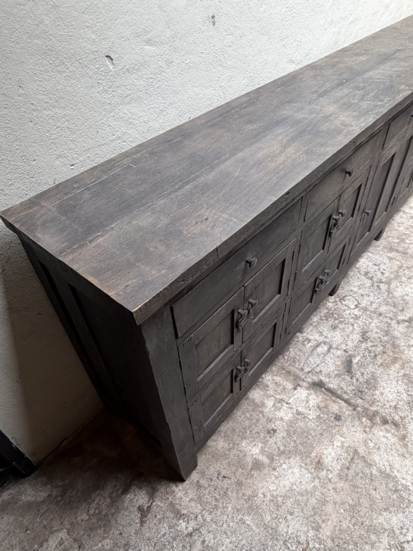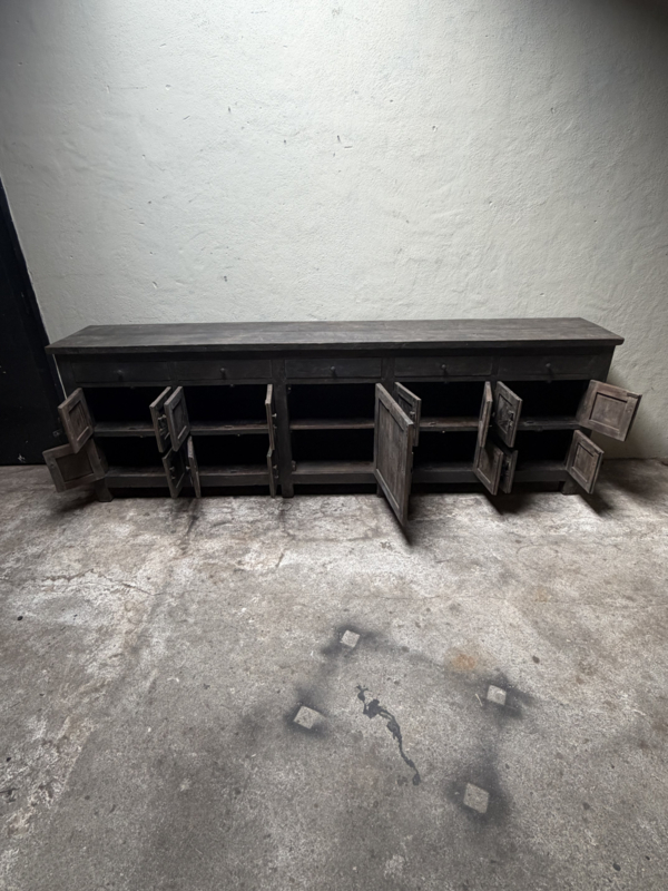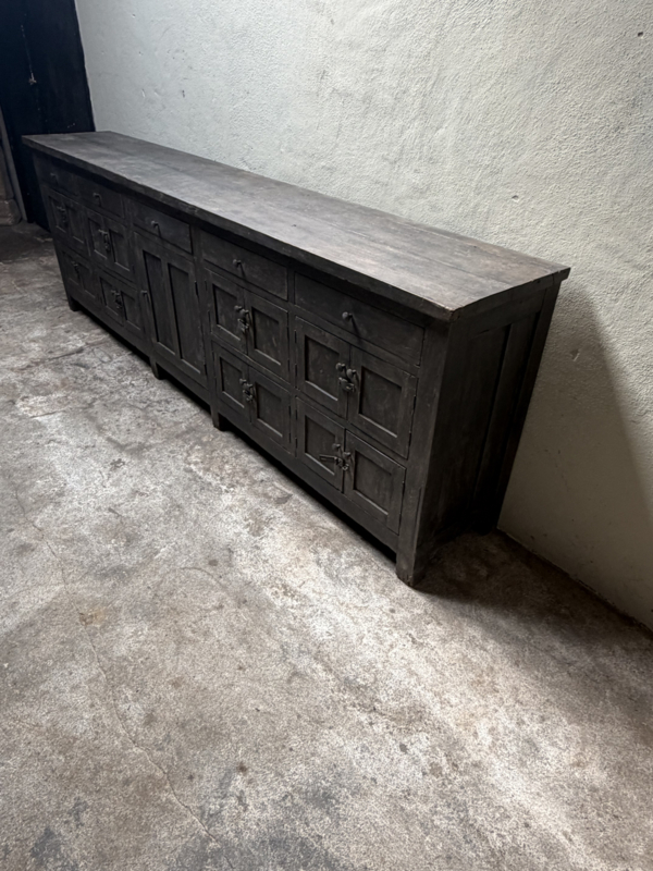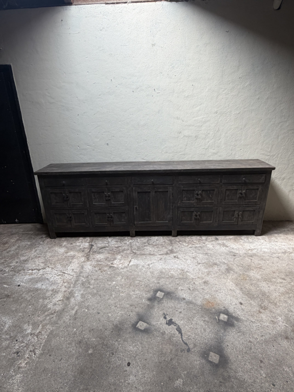 Grote lange grijze vergrijsd houten kast dressoir keukenblok werkbank L275 x D46 x H91 cm
