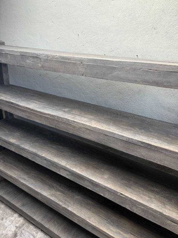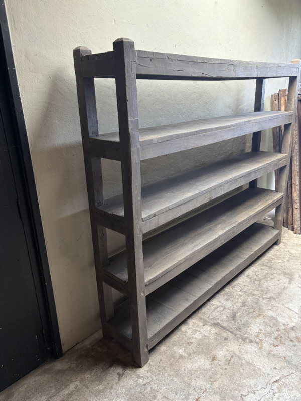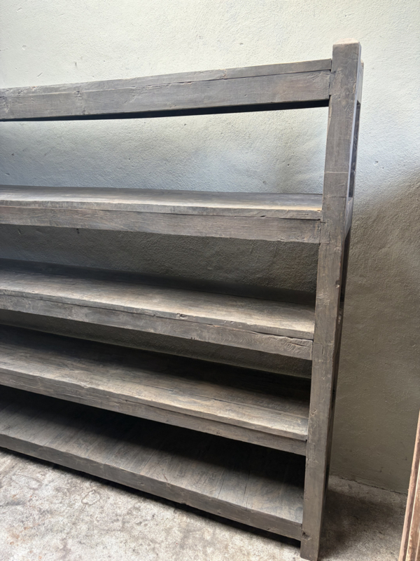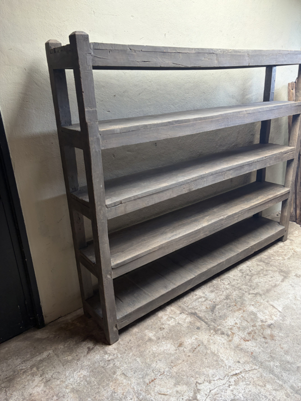 Stoere hoge oude houten kast schoenenrek keukenrek keukenkast legplanken landelijk industrieel vintage robuust boekenkast schap rek grof stoer hout