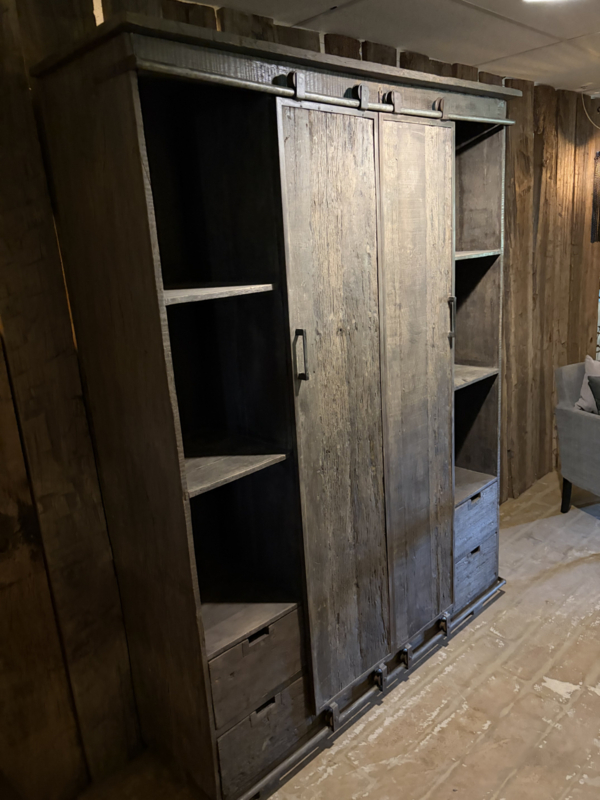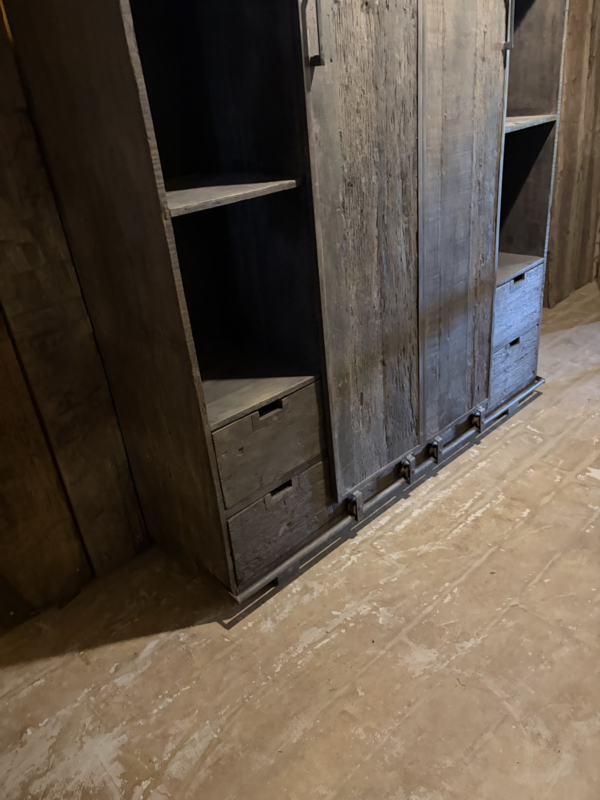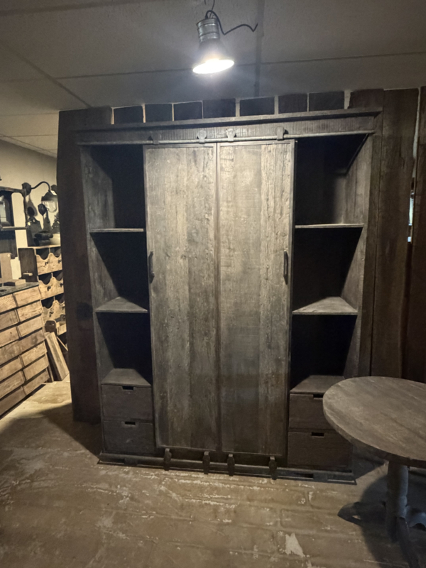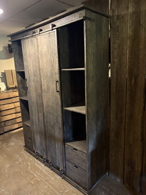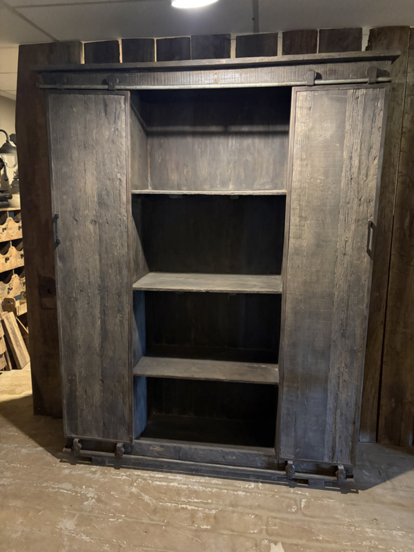 Grote donkere stoere vergrijsd houten kast landelijk schuifdeuren deuren lades schappen vakken industrieel keukenkast linnenkast