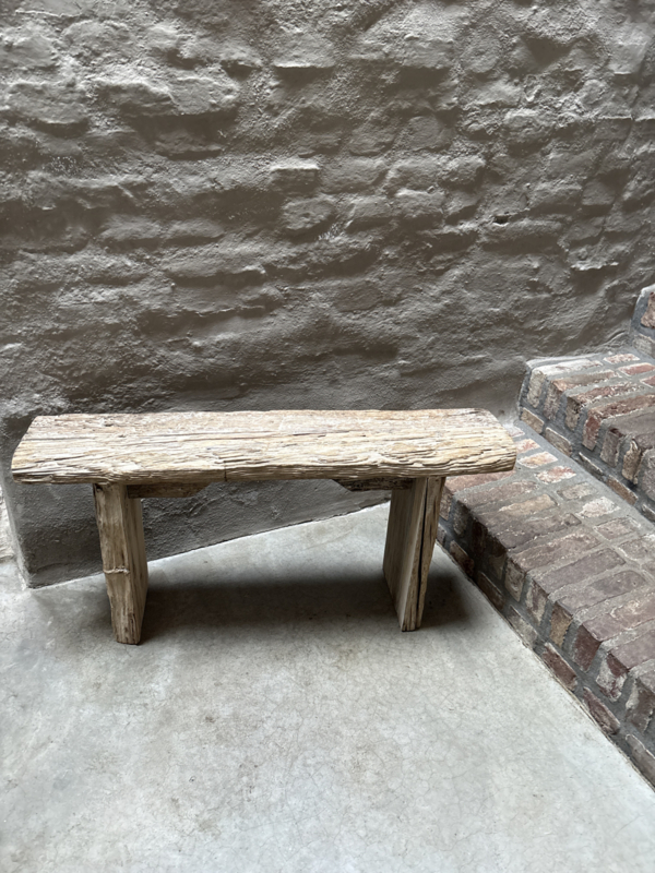 Oude vergrijsd doorleefd houten bijzettafel kruk elmwood nr 15 krukje tafeltje tafel landelijk stoer robuust grof hout nerfOude bijzettafel