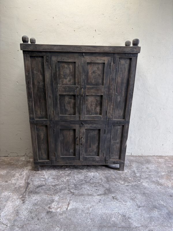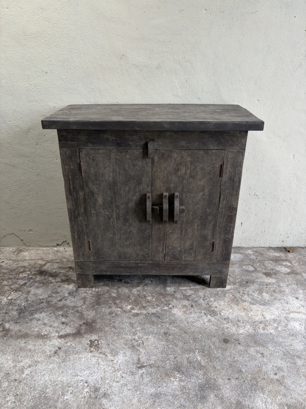 Oude vergrijsd houten nachtkastjes nachtkastje hal opzet toilet badkamer wandkastje boho Ibiza kastje kast halkastje wandmeubel stoer robuust landelijk industrieel metalen beslagStoere oud vergrijsd houten nachtkastjes kastje