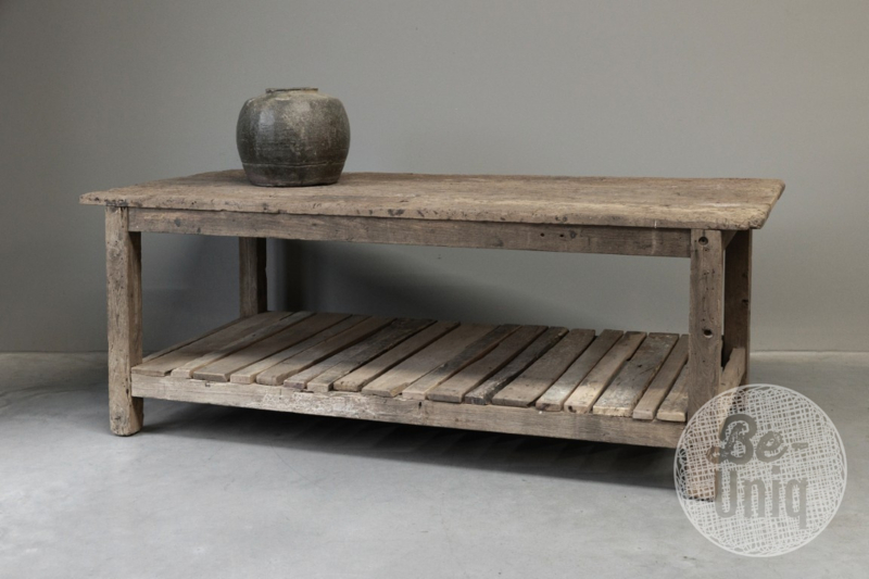 Grote oude robuust houten tafel fabriekstafel bijzettafel stoer landelijk industrieel vintage sidetable keukenelement kookeiland wastafel meubelStoere oude fabriekstafel wastafel meubel wastafelmeubel
