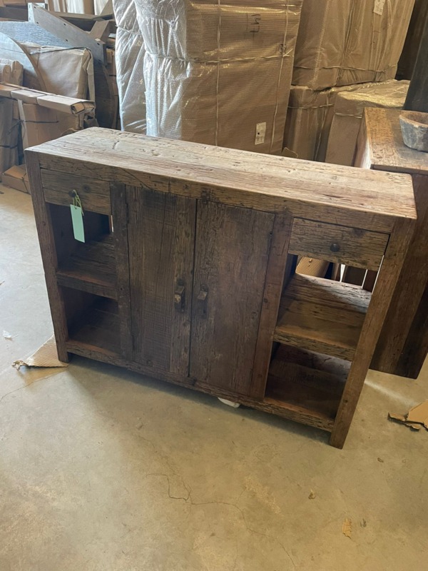 Stoer oud vergrijsd houten sidetable wandtafel wastafel wastafelmeubel badkamermeubel werkbank ladekast met onderplank landelijkL116,5 cm