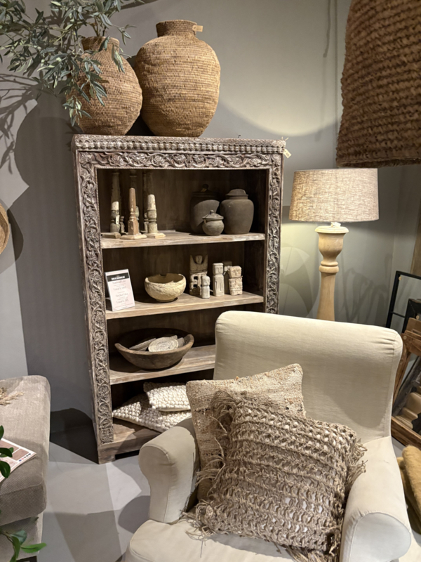 Grote oude open houten kast legplanken winkelkast schoenenrek sober landelijk stoer groot hout vergrijsd beige boekenkast keukenkastGrote oude houten kast