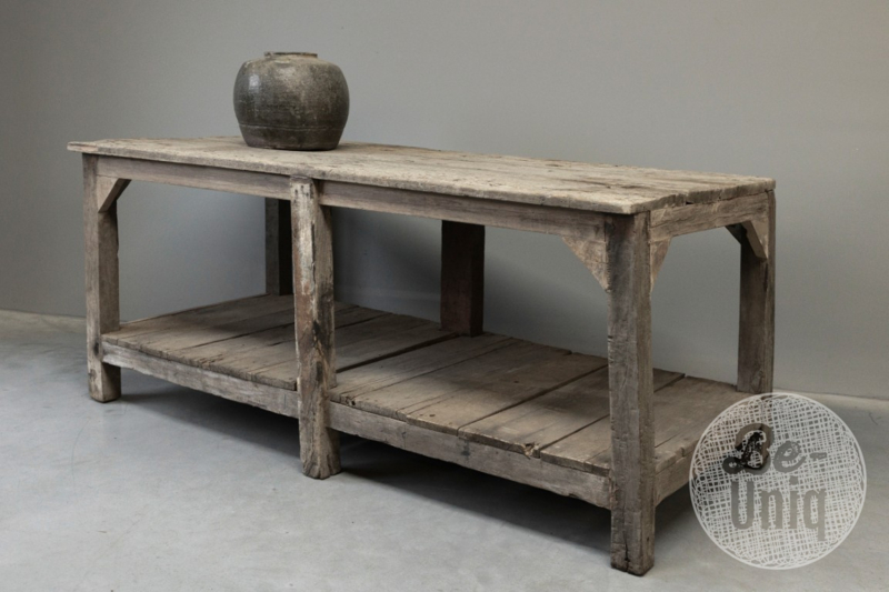 Oude robuuste landelijke vergrijsd houten sidetable wastafel meubel werkbank 190 x 35 x H79,5 cm landelijk stoer robuust grof houtHele stoere sidetable