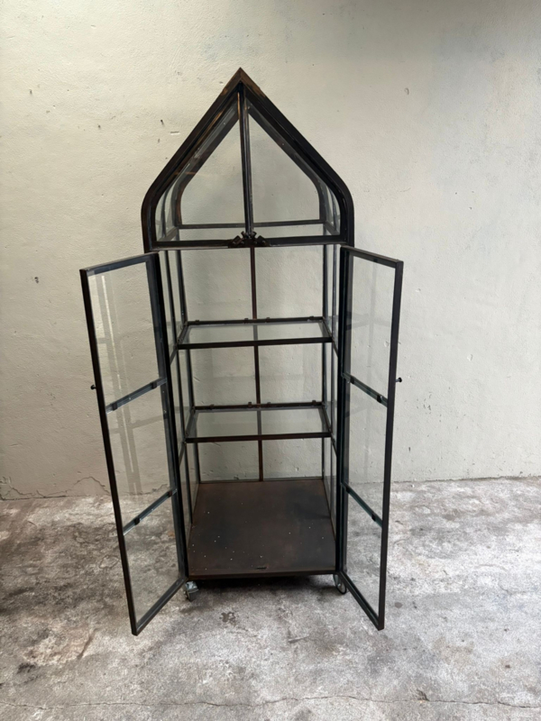 Mooie grote hoge kast met glas servieskast rechts 225 x 73 x 37 cm vitrinekast keukenkast zwart hout landelijk stoer industrieelPrachtige grote zwarte kast