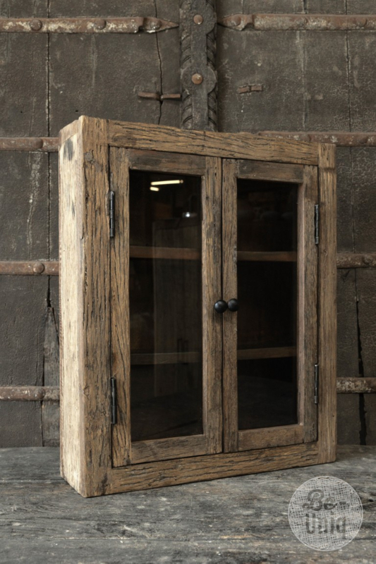 Landelijk oud truckwood railway houten vitrinekastje wandkastje vitrine glaskastje SEP stoer 55 x 35 x 13 cmHoogte 55 cm